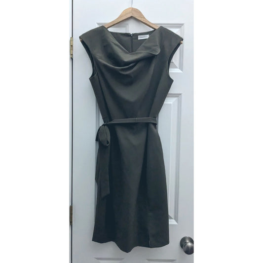 CALVIN KLEIN Army Green Pencil Sheath Dress Sleeveless Waist Tie Size 6