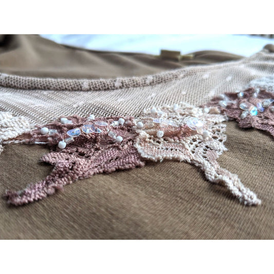 LINDEN HILL Tan Embroidered Long Sleeve Top Floral Lace & Sequin Embroidery Sz L