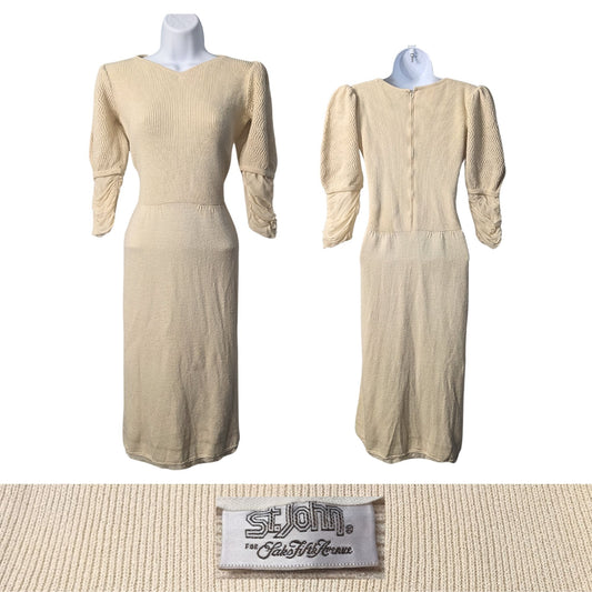 Original Vtg 80s ST. JOHN Ivory Santana Knit Chiffon Fringe Sweaterdress Size M