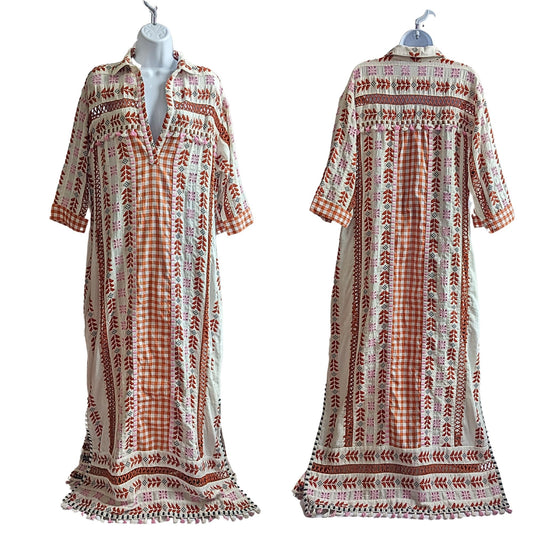 DODO BAR OR 100% Cotton Carmen Kaftan Orange Pink Embroidered Boho Dress Size M