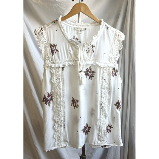 PALE SKY Boho Cross-Stitched White Embroidered Sleeveless Hi-Low Blouse size XXL