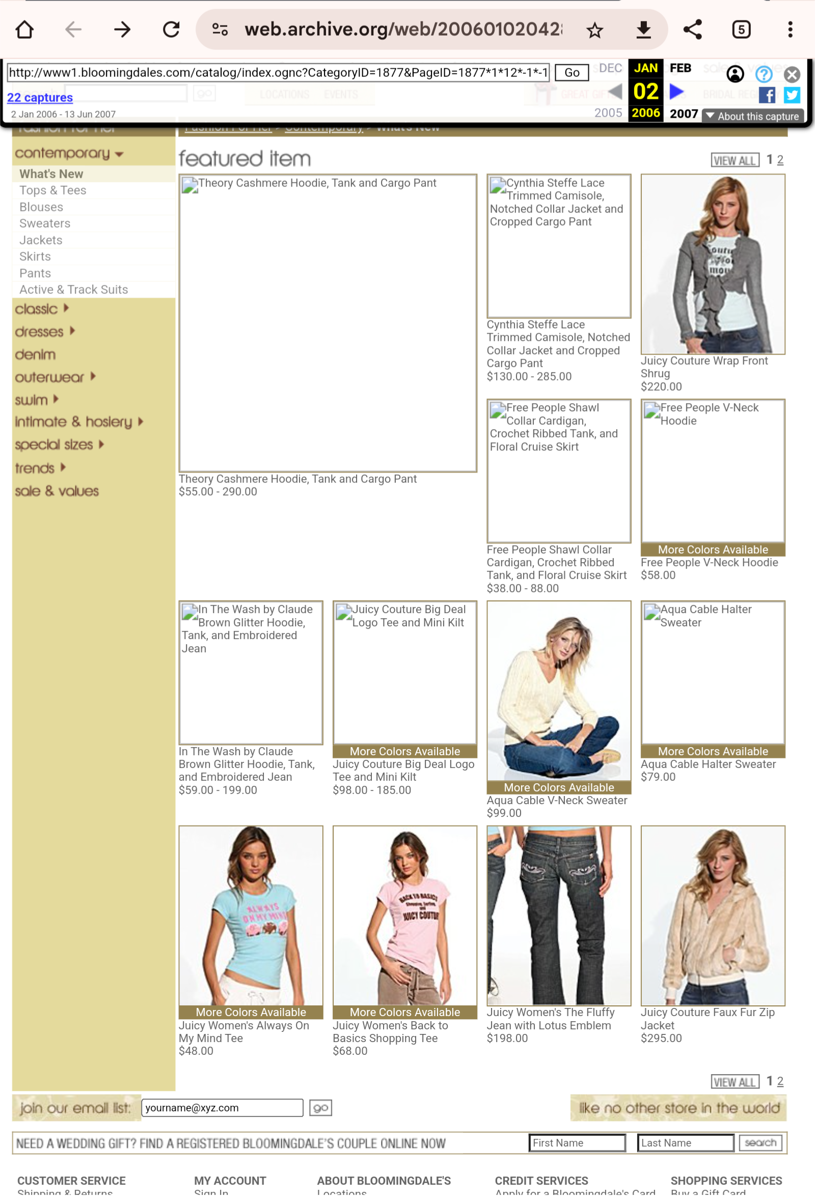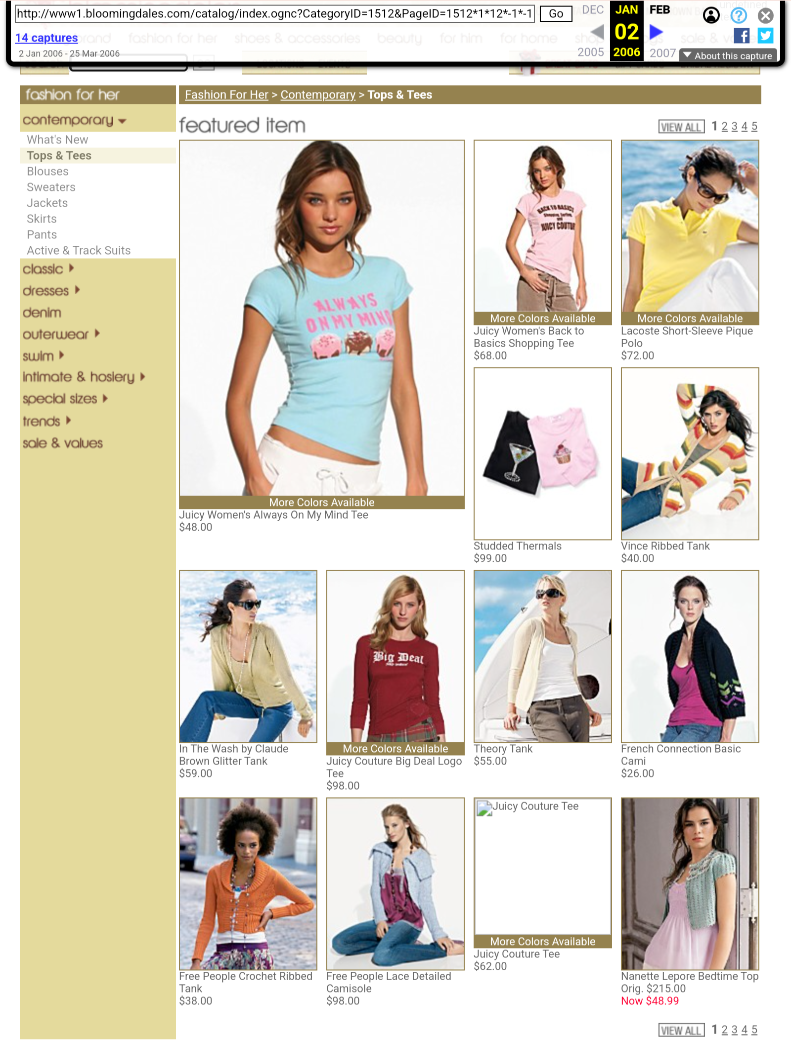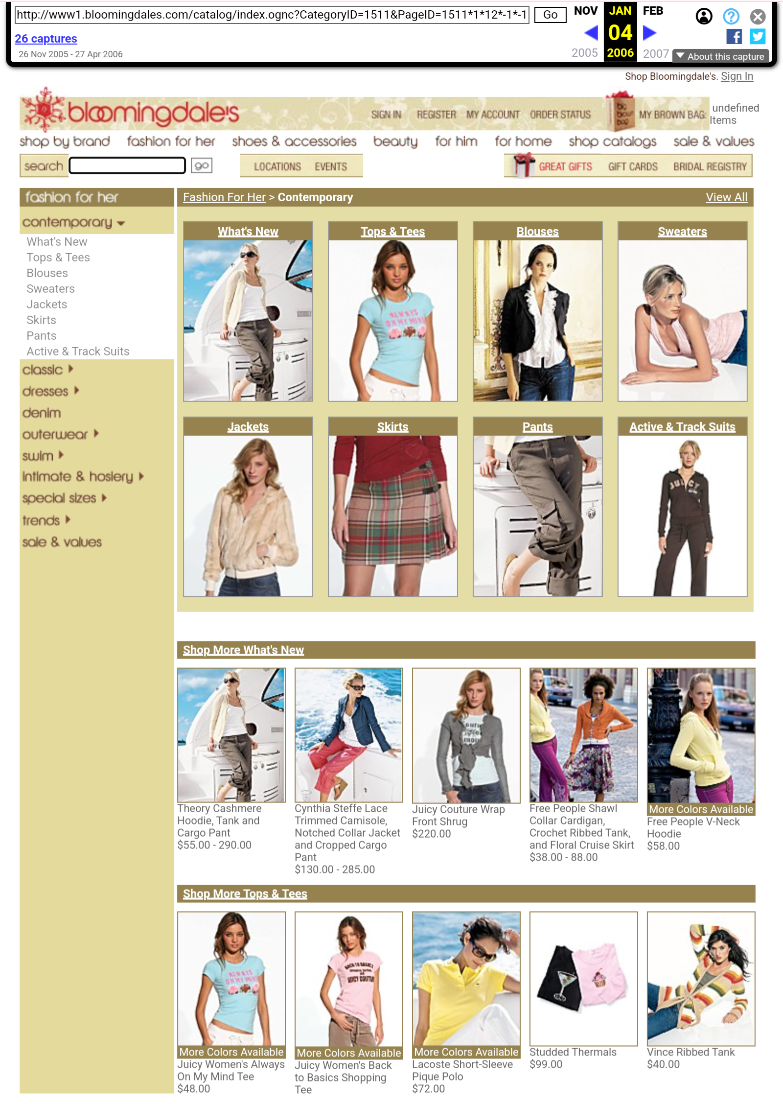 - https://web.archive.org/web/20060102051806/http://www1.bloomingdales.com/catalog/index.ognc?CategoryID=1512&PageID=1512*1*12*-1*-1&kw=Tops%20%26%20Tees